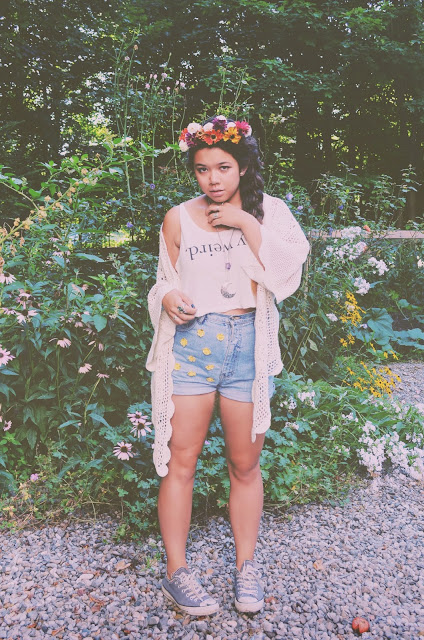 (Brandy Melville crop top, DIY shorts and flower crown, Kirra kimono, Converse sneakers, Free People moon pendant, vintage stone necklace, vintage silver rings, So Good bug ring)
